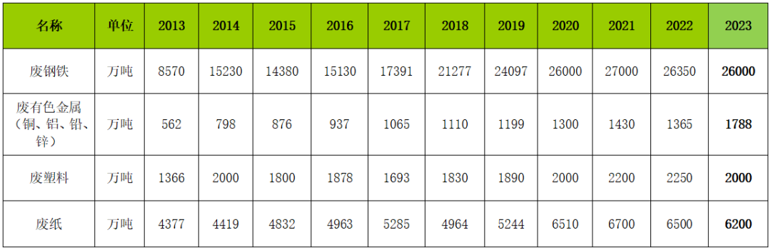 表2.我国2013-2023年废钢、废有色金属、废塑料、废纸回收量
