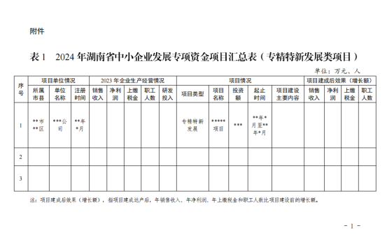 各市州和省财政直管县市工信、财政部门,省直有关单位:????为支持中小企业专精特新发展,完善中小企业服务体系,根据《湖南省中小企业发展专项资金管理办法》(湘财企〔2023〕6号),现就2024年湖南省中小企业发展专项资金项目申报工作有关事项通知如下:????1、申报单位在湖南省境内依法登记注册,具有独立法人资格,成立1年以上(截至2023年12月31日),财务管理制度健全,财务和信用状况良好。????2、项目符合国家有关法律法规和产业政策,符合专项资金支持的范围和具体方向。????3、存在以下情形之一的,不得申报本专项资金项目:????(1)已经申报2024年度其他省级财政专项资金项目(奖励类除外);????(2)2023年已获得省工信厅管理的专项资金支持的单位,不得申报本专项专精特新发展类项目(奖励类项目除外);????(3)2022-2023年连续两年获得省工信厅管理的专项资金支持的单位,不得申报本专项完善服务体系类项目(奖励类项目除外);????(4)被列入“信用湖南”黑名单或者近两年在安全生产(含网络安全)、产品质量、生态环保等方面有严重不良信用记录;????(5)近两年在项目申报中存在弄虚作假行为的单位。????2024年省中小企业发展专项资金重点支持以下几类项目:????支持重点:支持中小企业进行数字化、网络化、智能化建设,购置仪器设备,改造场地设施,引进技术及服务,增强研发创新能力,改进产品质量,提高生产技术水平和生产效率,加快专精特新发展。????申报范围:制造业中小企业,原则上是2023年认定的湖南省专精特新中小企业。项目符合专精特新发展方向,主要建设内容在2023年期间实施,主要投入发生在2023年,经济社会生态效益良好。????市州本级:长沙市25个,株洲市、湘潭市、湘西州各10个,衡阳市、岳阳市、常德市、益阳市、郴州市各8个,邵阳市、永州市、娄底市各6个,怀化市、张家界市各5个。????财政省直管县市:浏阳市、宁乡市各5个,其他省财政直管县市各2个。????支持重点:为完善服务功能而完成的改造建设,提升数字化赋能服务、市场开拓、信息发布推送、研发试验、专业服务、检验检测等服务能力(不含基建及厂房建设)的设备设施投入;为改善创业创新和融资环境对公用设备、软件升级、设施改造或新购等能力提升建设。????支持重点:支持开展“一起益企”中小微企业服务行动、中小企业服务月、科技成果赋智、质量标准品牌赋值、数字化赋能以及推进中小企业商业价值信用贷款改革试点等活动,对相关服务业务、服务活动支出给予补助。????完善服务体系1-2类项目申报范围:(1)全省中小企业公共服务机构。积极服务中小微企业,开展各类服务活动,绩效良好的中小企业公共服务机构。(2)省级中小微企业创业创新基地。在认定有效期内,开展形式多样、成效显著的服务中小微企业创业创新活动的省级中小微企业创业创新基地。(3)省专精特新中小企业股权融资服务平台。积极开展专精特新中小企业融资服务活动,为中小企业提供直接融资服务的专业平台。????市州本级:长沙市8个,株洲市、湘潭市、衡阳市、岳阳市、常德市、益阳市、郴州市、邵阳市、永州市、娄底市各4个,怀化市、湘西州、张家界市各2个;????支持对象:2023年“创客中国”湖南省中小微企业创新创业大赛一、二、三等奖获奖单位。????(一)市州本级项目,由市州工信部门会同财政部门组织申报、审核,统一行文(含附件《2024年湖南省中小企业发展专项资金项目汇总表》,以下简称《项目汇总表》)上报省工信厅、省财政厅。????(二)财政省直管县市项目,由县市工信部门会同财政部门组织申报、审核,统一行文(含《项目汇总表》)上报省工信厅、省财政厅,同时抄报所在市州工信、财政部门。????(三)省直单位申报服务体系项目,由省直主管部门审核并行文报省工信厅、省财政厅。????(四)审核部门对项目申报单位信用情况在“信用湖南”网站进行查询。各级工信、财政部门要对项目是否符合国家法律法规和产业政策、是否符合专项资金支持范围和方向严格审查,对项目资料真实性、完整性、准确性、规范性严格审查。????(一)项目申报资料提交方式:实行网上申报方式,不受理纸质申报资料。项目单位必须通过《湖南省工业和信息化厅项目管理系统》(http://222.240.80.54:8086/pmp/a/login)或《湖南省财政企业项目资金管理系统》(http://220.168.30.70:28889)填报,严格按照项目类别申报模板(从《湖南省工业和信息化厅项目管理系统》中下载)编制申报资料、进行在线提交。各级工信、财政部门对网上申报资料进行审核上报。????(二)上报文件要求:市州和省财政直管县市工信、财政部门将申报文件(PDF格式)和《项目汇总表》(Excel格式)上传到《湖南省工业和信息化厅项目管理系统》或《湖南省财政企业项目资金管理系统》。????(三)截止日期:2024年6月21日前完成项目申报系统审核上报流程,逾期不予受理。????1、项目资料是项目评审、资金安排、监督管理、绩效评价等工作的重要依据,各申报单位对项目资料真实性负责。????2、所有申报内容需按照要求如实填写,准确完整,不得缺项漏项;申报材料真实性承诺及所提供的相关附件要求字迹及公章清晰;其他相关扫描件均要求资料字迹、印章清晰。主体材料不齐全的项目不予受理。????3、项目申报系统填报的申报资料,包括企业申报材料真实性承诺、申请报告