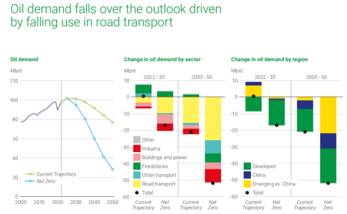 这得益于风能和太阳能的快速发展,在全球发电结构当中,风能和太阳能占比将从今天的10%增长到2050年的50%(当前情景)和70%(净零情景),加速推动能源替代。“第三个共同趋势是全球石油需求都将下降,只是两种情景的下降速度和程度有巨大区别,在“当前路径”下,石油消费量会在2050年降至约每天7,500万桶的消费的水平,而在“净零情景”下下降速度更快,到2050年,石油需求将降至每天2,500万桶到3,000万桶,比目前的水平降低大概70%。”戴思攀说。