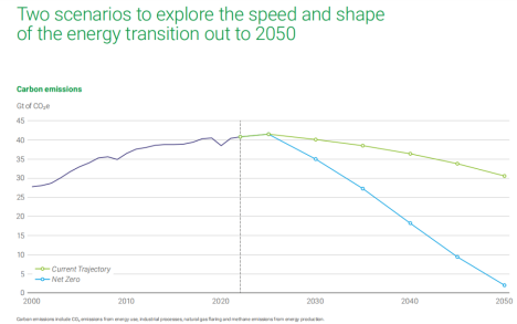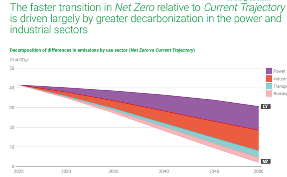 “净零情景中”的排放在2°C预算内,而在“当前路径”下,累计排放量在2040年代初期就超过了预算。为了探索相关的风险,bp设置了第三个情境——延迟且无序的情境。这一情景假设全球能源体系继续按照当前路径持续一段时间之后再采取政策和行动加速减碳以符合升温两度的碳预算,它还假设:以“有序”方式(即不依赖于具有过高经济和社会成本的政策和行动)进行脱碳的速度是有限的。“有序”转型速度如果与净零情景的去碳速度一致,能源系统可以沿着当前轨迹路径继续运行的最晚日期是在下个十年初,然后转向快速去碳化,符合2°C碳预算,这一“推迟净零”的路径(Delayed Net Zero)将在2050年代中期实现净零排放。“有序”转型速度如果与IPCC情景中建模的最快去碳化速度一致,这意味着在2030年代中期之前需要从当前轨迹路径转向快速去碳化路径,以保持在2°C预算内。“这两个数值表明,如果推迟到2030年代初至中期才转向加速的去碳化路径,将温升控制在2°C以内需要采取昂贵的无序措施来缩减未经减排的化石能源。”戴思攀说。“净零情景”中相对于“当前路径”转型更快,主要是由电力和工业部门的更大减碳驱动的。