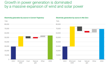 不过两种情景的转型时间和强度不同,在“当前路径”下,能源转型将在2030年代和2040年代进入“替代”阶段,而到2050年,“当前路径”下的未减排的化石燃料仍占一次能源的三分之二;“净零情景”下,低碳能源的更大幅度增加和能源效率的提升使能源系统在2020年代进入能源替代阶段,到2050年,未减排的化石燃料在一次能源中的占比降至不到20%,能源净碳排放接近于零。第二个共同趋势是在成本下降和能源系统电气化稳步增加的支持下,风能和太阳能发展迅速。这要求全球电力系统通过升级电网、提高系统灵活性、储能和可靠的备用容量来增强其应对发电量波动的能力。