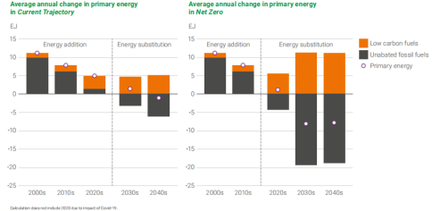 “净零情景”下累积碳排放量大致位于IPCC C2和C3情景的中间地带,而C2情景意味着有50%以上的概率人类能够把全球升温控制在1.5摄氏度以内。而C3情景就意味着有67%的概率将全球升温控制在2°C以内。相比之下,“当前路径”下的累计碳排放量高于IPCC C5情景的中点,C5情景指有超过50%的概率将温升控制在2.5°C%。这表明:“净零情景”的去碳化速度和程度大致与实现巴黎气候目标的一系列IPCC情景一致,而“当前路径”的排放情况不符合实现巴黎气候目标的要求。“当然这两个情景有可能是完全错误的,我们无法精准预测未来,只能依据这两个情景粗略的描述未来25年能源转型的路径。”戴思攀说。两种情景覆盖了能源转型中的各种挑战,有些要素的变化趋势在两种情境中是共同的,因此同样的趋势在介于这两种情景之间的转型路径中也可能发生,但有些要素的发展趋势在两种情景中完全不同,意指这些要素会因转型速度的不同而发生变化。报告认为全球能源系统的挑战在于,这将是历史上首次在能源转型期间,从能源增加阶段转变为能源替代阶段。戴思攀表示,过去 100 年的几次能源转型中,世界一直处于能源增加阶段,无论煤还是石油占据主导,任何一种能源的消费量都没有持续减少过,要实现碳排放下降,不能无限期停留在能源增加阶段,两个情境的第一个共同的趋势就是从能源增加转向能源替代,实现低碳能源的增长超过能源需求的增长。只有当“新”能源(此时为低碳能源)的增长超过全球能源总需求的增长,“旧”能源(未减排的化石燃料)的使用才会在绝对意义上减少。