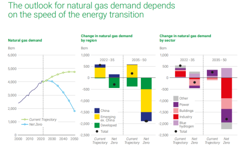全球石油需求下降的主要驱动力是交通部门能源效率提高和电气化。在两种情景之下,到2050年,电动车数量将增加到12.5亿甚至20亿辆之间,而道路交通的石油使用量将从2022年的大概每天4,000多万桶下降到2050年的2,500万桶,甚至只有500万桶每天。还有一些能源要素的变化趋势取决于能源转型的速度,在两种情景中截然不同,比如天然气。戴思攀说:“对于大多数燃料我们可以大致预测其消费量变化等,但是对于天然气甚至无法做出一个大概的判断,在“当前路径”之下,天然气的需求到 2050 年之前都将增长,而在“净零情景”下,全球天然气需求会在不久后(2030年前)达峰,到 2050 年降到当前水平的一半左右。”