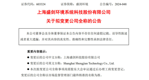 此前,6月20日,盛剑环境发布公告称,公司第三届董事会第二次会议审议通过《关于拟变更公司全称的议案》,拟将公司全称由“上海盛剑环境系统科技股份有限公司”变更为“上海盛剑科技股份有限公司”,英文全称相应变更为“Shanghai Shengjian Technology Co., Ltd.”,证券代码“603324”保持不变。