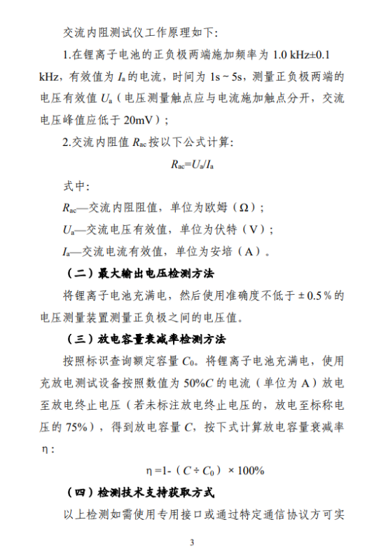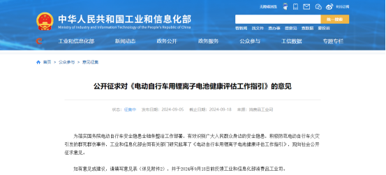 为落实国务院电动自行车安全隐患全链条整治工作部署,有效识别广大人民群众身边的安全隐患,积极防范电动自行车火灾引发的群死群伤事件,工业和信息化部会同有关部门研究起草了《电动自行车用锂离子电池健康评估工作指引》,现向社会公开征求意见。如有意见或建议,请填写意见表(详见附件2),并于2024年9月18日前反馈工业和信息化部消费品工业司。邮 箱:luoruidong@miit.gov.cn附件:1.电动自行车用锂离子电池健康评估工作指引.pdf 2.《电动自行车用锂离子电池健康评估工作指引》反馈意见表.doc工业和信息化部消费品工业司