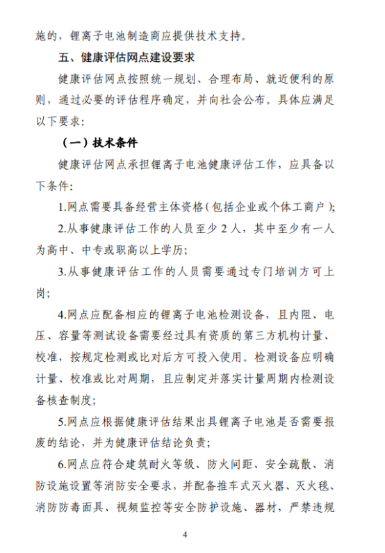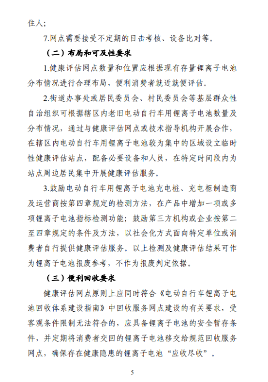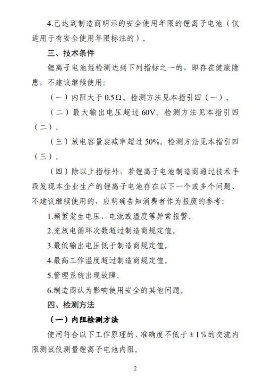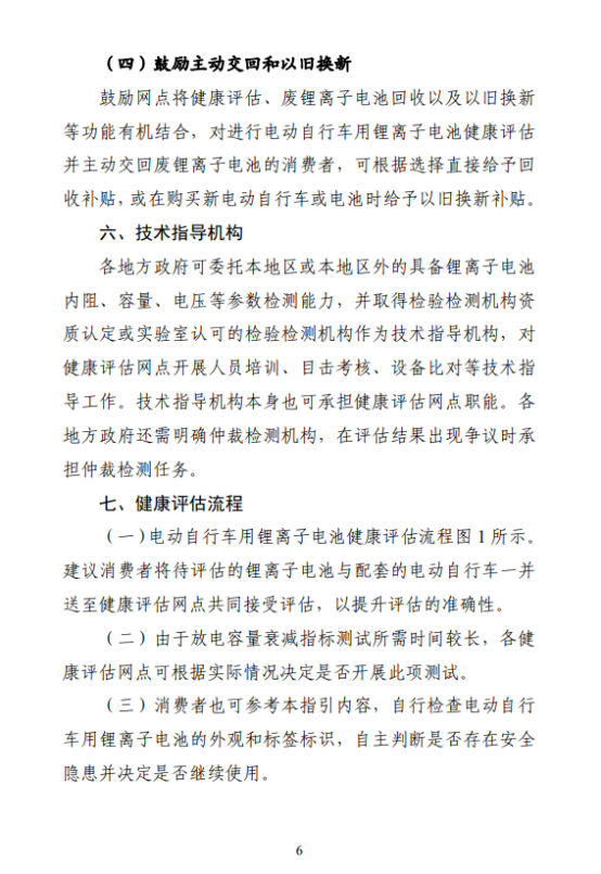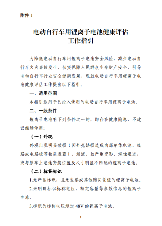 为落实国务院电动自行车安全隐患全链条整治工作部署,有效鉴别广大人民群众身边的安全隐患,积极防范电动自行车火灾引发的群死群伤事件,近期,工业和信息化部会同有关部门起草了《电动自行车用锂离子电池健康评估工作指引》(简称《健康评估指引》)。为更好地理解并执行,现就有关内容解读如下:我国是全球电动自行车生产、消费大国,目前国内电动自行车社会保有量已超3.5亿辆。随着产销量逐年增长,锂离子电池电动自行车总量和占比也逐步提高。锂离子电池具有小巧轻便、使用寿命长等优点,但其能量密度较高,内部的有机电解液化学特性活泼,在使用不当的情况下易发生燃烧和爆炸等安全事故。特别是随着使用时间的增加,锂离子电池安全性会不断下降,事故风险进一步上升。近两年,电动自行车火灾事故呈多发、频发态势,其中很多都是由锂离子电池故障引发的。按照国务院电动自行车安全隐患全链条整治工作部署,工业和信息化部会同有关部门起草了《健康评估指引》,旨在建立科学、准确、简便的锂离子电池健康评估流程和判定规则,高效便捷地鉴别出已存在严重安全隐患、不适合继续使用的锂离子电池,并提示消费者及时妥善加以处理,从而降低存量电动自行车安全风险,减少发生在老百姓身边的火灾事故,切实保障人民群众生命财产安全。二、老旧电动自行车用锂离子电池存在安全隐患的原因是什么?目前,在全社会存量电动自行车用锂离子电池中,很多都存在使用时间长、使用环境及保养条件差、质量参差不齐等问题,甚至有的还经过了拼改装,具有较大安全隐患。根据国家消防救援局的统计,2022年及2023年全国分别接报电动自行车火灾1.8万起、2.1万起,分别同比上升23.4%、17.4%。老旧锂离子电池存在安全隐患的原因主要包括以下几个方面:一是使用年限偏长。据估算,截至目前全社会配备锂离子电池的电动自行车保有量已超5000万辆,其中很多电池都使用了3年乃至更长时间。锂离子电池自身的电化学特性决定了在充电过程中,其负极表面很容易析出树枝状金属锂,形成“枝晶”。随着使用时间和充放电循环次数的增加,“枝晶”会逐渐增大,最终刺穿电池隔膜造成内部短路,导致电池内部温度迅速提高,引发起火甚至爆炸。为防止电动自行车用锂离子电池使用时间过长导致安全事故,新发布的《电动自行车用锂离子蓄电池安全技术规范》(GB 43854—2024)规定了电池应标注安全使用年限,超出安全使用年限的电池不建议继续使用,但新标准发布前生产的电动自行车用锂离子电池绝大多数未标注安全使用年限,“超期服役”现象十分普遍。二是拼改装电池隐患大。目前消费者使用的电动自行车用锂离子电池中,除正规厂家生产的合格产品外,一些拼改装的锂离子电池也占有一定比重。这些电池多是由无质量保障条件的小作坊使用梯次利用乃至报废淘汰的电芯自行组装生产的,虽然价格便宜,但电芯之间一致性较差,基本未经过严格的针刺、过充电、过放电、热滥用等测试验证,电池管理系统(BMS)也较为简陋甚至缺失,难以在电池出现过充电、过放电、短路、温度异常等情况时加以有效保护,非常容易引发恶性火灾事故,存在的风险隐患不可小觑。三是使用环境及保养条件较差。锂离子电池由于能量密度高、电极材料及电解液较为活泼等因素,需要尽量保持较为稳定的使用环境,一旦发生碰撞、挤压、受潮等情况,都有可能导致安全事故。但电动自行车用锂离子电池在实际使用中,很难始终保持理想的条件,在行驶和停放过程中电池受振动、磕碰、淋雨进水乃至摔落等情况时有发生,有些消费者手中的电池已出现外壳明显破损、内部电芯及保护电路外露等情况,却仍在继续使用,这些电池随时都有可能发生安全事故。《健康评估指引》适用于已经进入使用环节的电动自行车用锂离子电池。在操作过程中,有以下几方面问题易发生混淆,需要重点加以把握。首先,《健康评估指引》适用于在电动自行车上使用的锂离子电池,不适用在电动摩托车、电动滑板车等其他电动车辆上使用的电池,也不适用于虽然安装在电动自行车上但不作为动力电池使用的锂离子电池(如单独为防盗系统供电的锂离子电池等);其次,《健康评估指引》适用于电动自行车用锂离子电池,不适用于铅酸蓄电池、钠离子电池等用于电动自行车的其他类型电池;第三,无论是从正规渠道购买的知名品牌锂离子电池,或是从非正规电池作坊购买的锂离子电池,甚至是消费者自行拼改装的锂离子电池,只要用于电动自行车产品,均适用于本指引。四、《健康评估指引》可为哪些群体开展电动自行车用锂离子电池健康评估提供指导?(一)消费者个人可依据《健康评估指引》进行简单的外观和标签检查,自行判断所使用的电池是否适合继续使用。对于电池内阻、最大输出电压及放电容量等技术指标,建议消费者前往健康评估网点,由专业的工作人员使用专用设备检测后给出专业化的健康评估结论,不建议消费者自行检测。(二)各地人民政府可依据《健康评估指引》在本地区布局建设健康评估网点,为消费者的老旧电动自行车用锂离子电池提供专业、有公信力的健康评估服务,对电池出具权威的报废判定结论,并指导消费者妥善处置需要报废的锂离子电池。(三)电动自行车和锂离子电池生产、销售