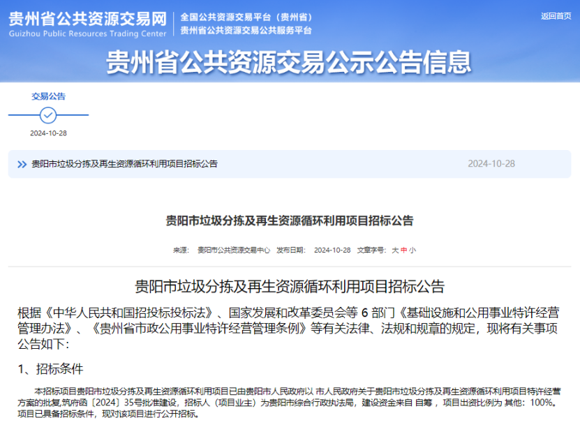 贵州省公共资源交易网消息,10月28日,贵阳市垃圾分拣及再生资源循环利用项目正式挂网招标,特许经营权使用费投标最低限价302,619.10万元(约30.26亿元),特许经营期30年(含建设期2年),计划于2024年11月18日开标。公告显示,本项目建设内容包括建设运营再生资源综合分拣中心、搭建贵阳贵安再生资源循环利用信息化平台、构建贵阳贵安再生资源循环利用体系,最终形成年分拣能力不低于256.51万吨的再生资源综合分拣中心,建设地点包括贵阳市10区县及5功能区。注:六区:云岩区、南明区、花溪区、乌当区、白云区、观山湖区;一市:清镇市;三县:修文县、开阳县、息烽县;五功能区:高新区、经济区、综合保税区、双龙航空港经济区、贵安新区直管区。特许经营范围为对贵阳市行政区划范围内贵安新区直管区受托管理范围内的包括但不限于废钢铁、废有色金属、废纸等可回收再生资源进行分类分拣,销售给末端资源化利用企业及其他相关主体。在特许经营期内,特许经营单位通过回收包括但不限于废钢铁、废有色金属、废纸、废玻璃等可回收再生资源得到的销售收入,聚焦使用者付费,通过使用者付费的收入,覆盖建设成本,平衡建设运营成本费用及实现合理利润。贵阳项目是资源循环央企“中国资环集团”挂牌成立后发布的首个省会城市全域资源循环特许经营项目。10月18日,中国资源循环集团有限公司(中国资源循环集团)在天津成立。这是中国第98家央企,也是国内首家资源循环央企。中共中央总书记、国家主席、中央军委主席习近平就组建中国资源循环集团作出重要指示强调,打造全国性功能性资源回收再利用平台、推动国民经济循环质量和水平持续提升。李强作出批示。